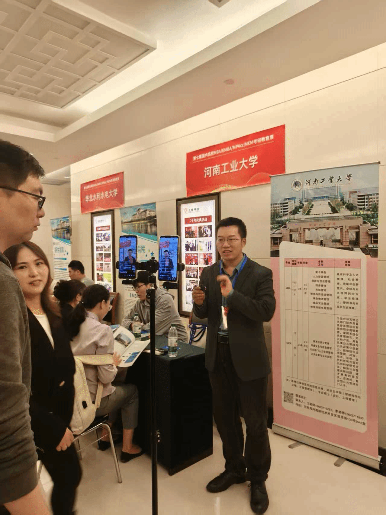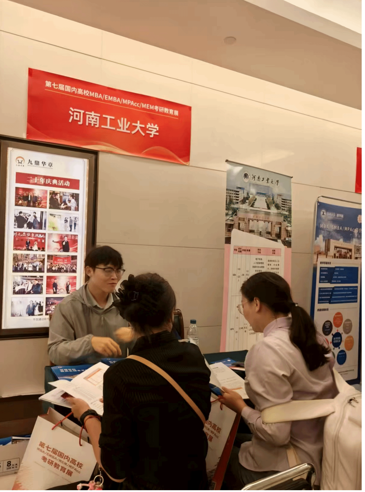 2025年9月20日,河南工业大学管理学院参加由郑州九鼎华章举办的第七届MBA/EMBA/MPAcc/MEM高校教育展。展会采取线上线下同步联动的形式,十余所院校招生负责人与考生集中交流,显著提升了信息获取的覆盖面与便利性。