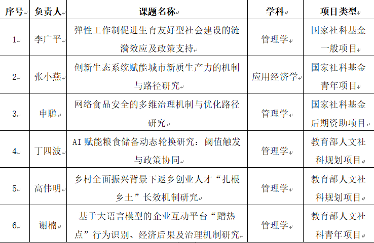 近日,根据全国哲学社会科学工作办公室、教育部社科司陆续公布的立项结果,管理学院在2025年度国家级项目申报中再次取得好成绩,共获批6项国家级项目,其中国家社会科学基金项目3项,教育部人文社会科学研究一般项目3项,具体立项情况如下: